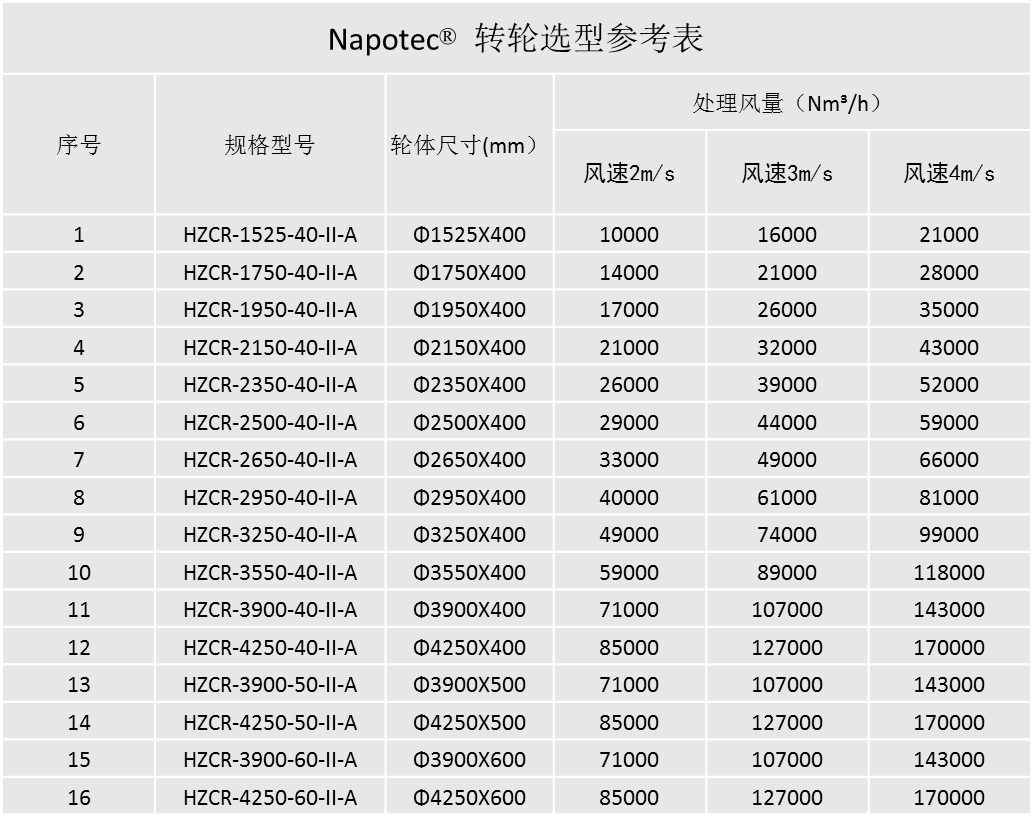 Napotec?分子篩轉(zhuǎn)輪選型表