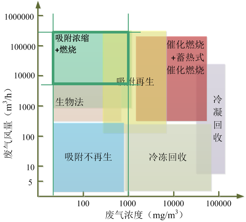 不同行業(yè)、不同工況條件下產(chǎn)生的VOCs組分不同,對處理方法也提出了不同的要求,根據(jù)組分性質(zhì)及工況條件的不同,對于大風(fēng)量(>10000m3/h)、低濃度低(<1000mg/m3)時,適宜采用吸附濃縮+熱氧化的組合工藝。