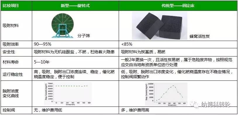Napotec?分子篩轉輪濃縮轉輪適合處理大風量低濃度的VOC廢氣,與傳統(tǒng)的床式蜂窩活性炭裝置相比具有操作連續(xù)性、材料壽命長、運行穩(wěn)定性好、吸附效率高、維護費用低、安全可靠等優(yōu)點,詳見下表: