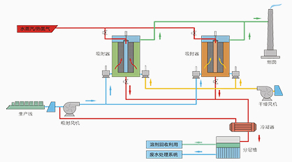 吸附回收主要是利用吸附材料將廢氣中的有機溶劑吸附下來,并脫附回收的方法。通過吸附系統(tǒng),不僅可以使廢氣中VOCs濃度大大降低,實現(xiàn)廢氣達標排放,而且吸附后通過解吸,收集物可回用于生產(chǎn),實現(xiàn)物料的循環(huán)利用,減少物料消耗。