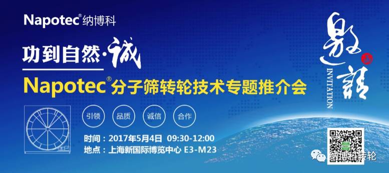青島納博科環(huán)保科技有限公司借第十八屆中國環(huán)博會舉辦為契機,定于2017年5月4日在上海新國際博覽中心E3大氣館M23會議室召開“Napotec?分子篩轉(zhuǎn)輪技術(shù)專題推介會”。屆時,納博科環(huán)保將帶您解讀前沿性環(huán)保政策,以及國產(chǎn)沸石分子篩轉(zhuǎn)輪“Napotec?分子篩轉(zhuǎn)輪”技術(shù)詳解。同期,在E3-3730納博科展廳,專家在上午10點和下午2點分別進行VOC治理專業(yè)講解,為您答疑解惑。