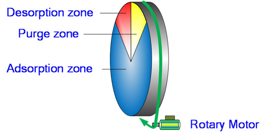 旋轉(zhuǎn)吸附轉(zhuǎn)輪的密封系統(tǒng)分為處理區(qū)域和再生區(qū)域,吸附轉(zhuǎn)輪緩慢旋轉(zhuǎn),以保證整個吸附為一個連續(xù)的過程。當(dāng)處理廢氣通過轉(zhuǎn)輪的處理區(qū)域時,其中的廢氣成分被轉(zhuǎn)輪中的吸附劑所吸附,轉(zhuǎn)輪逐漸趨向飽和;這時,處理廢氣被凈化而排空。同時,在再生區(qū)域,高溫空氣穿過吸附飽和的轉(zhuǎn)輪,使轉(zhuǎn)輪中已吸附的廢氣被脫附并由高溫空氣帶走,從而恢復(fù)了轉(zhuǎn)輪的吸附能力,達(dá)到連續(xù)去除VOCs效果的同時,還提高了廢氣濃度,便于進(jìn)行高溫氧化處理。